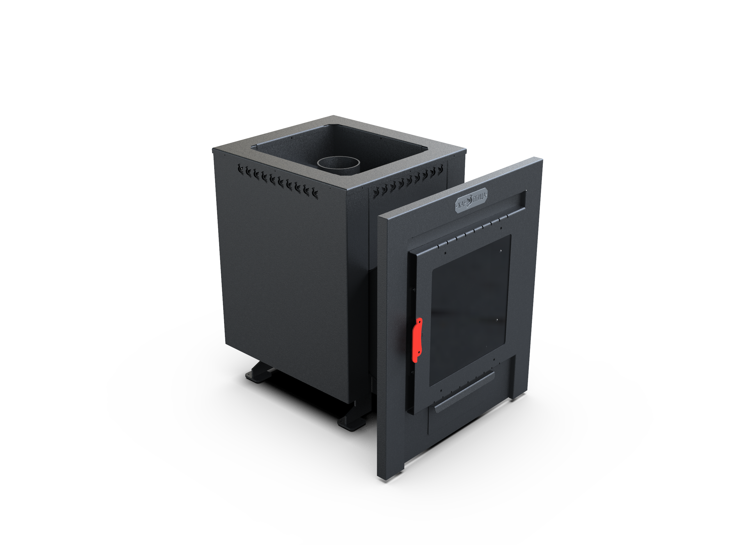 Панорамная дверца подчёркивает статус модели, конструкция делает её удобной для размещения в парных до 18 м³.