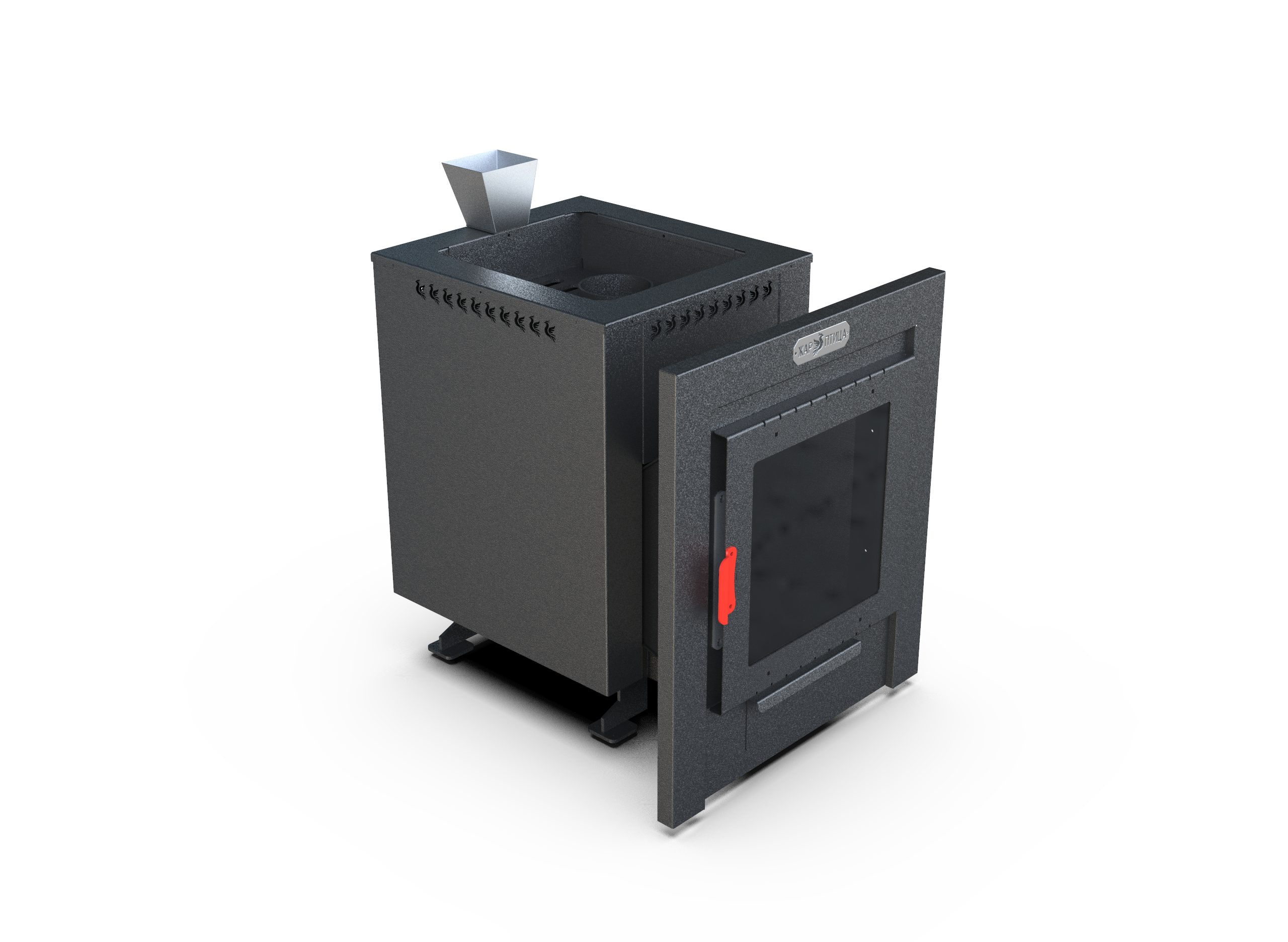 Панорамная дверца подчёркивает статус модели, а конструкция делает её удобной для размещения в парных до 18 м³.