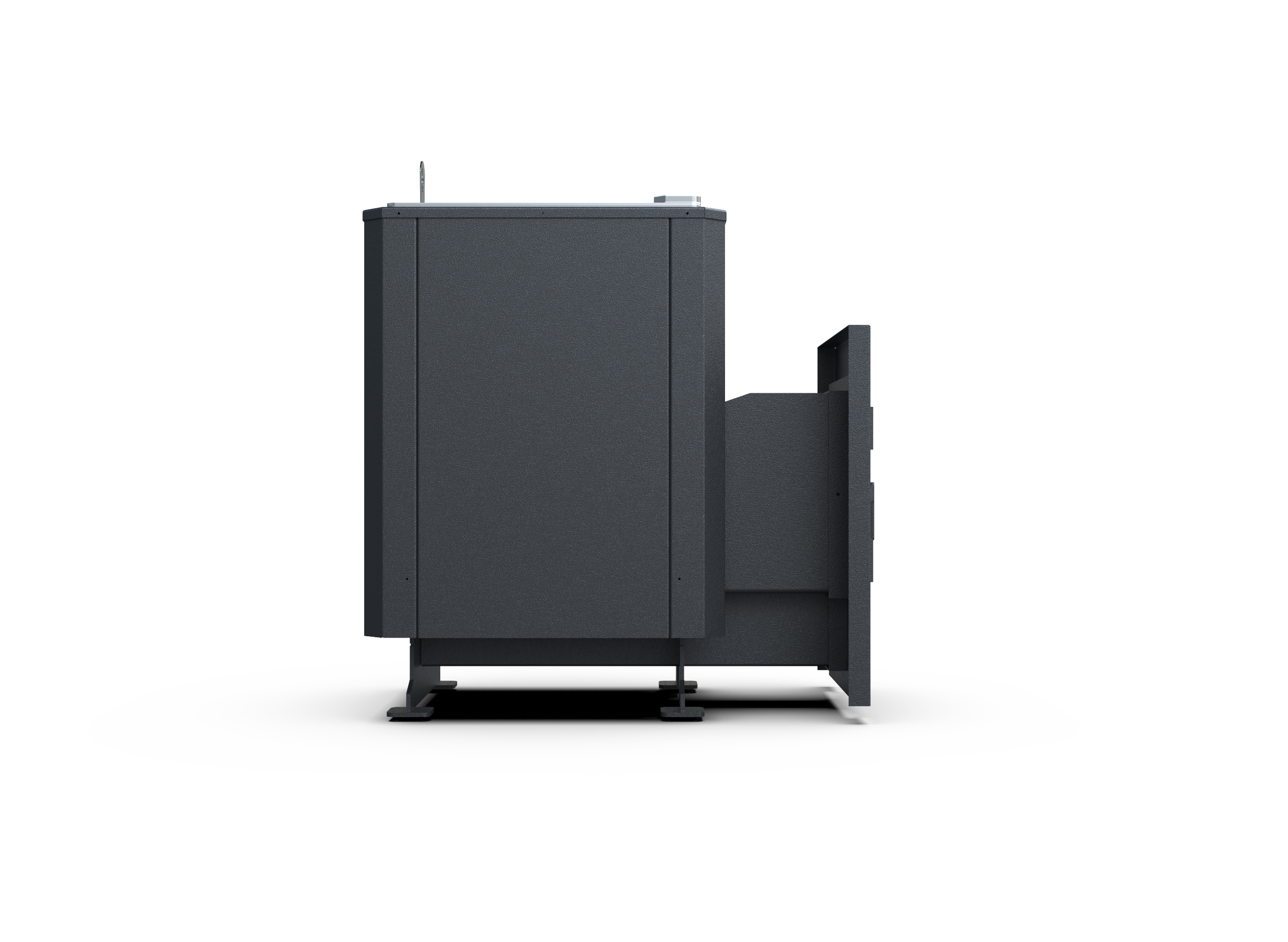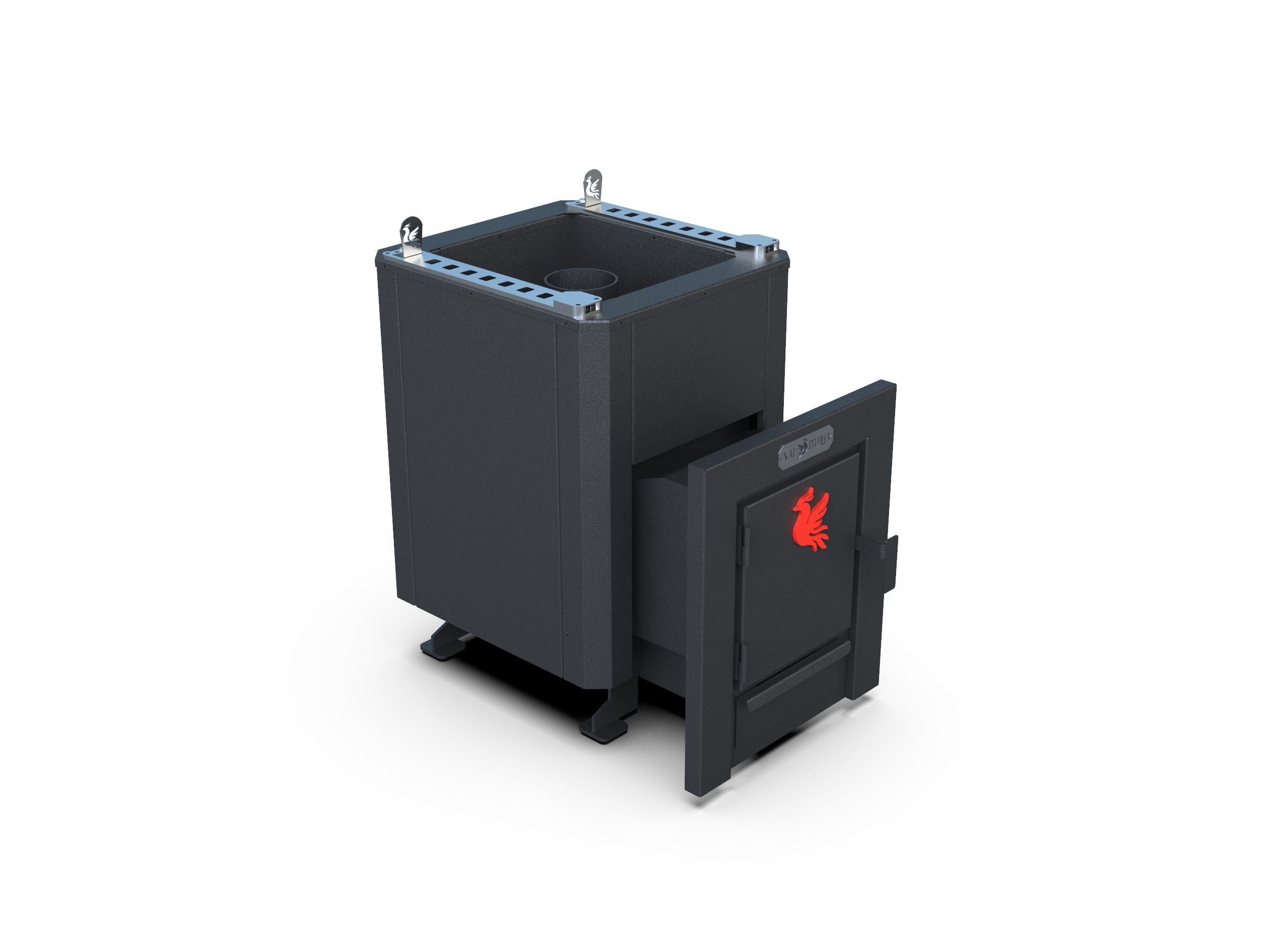 Усиленная версия из стали 8 мм рассчитана на интенсивную эксплуатацию. Открытая каменка быстро прогревает помещение.