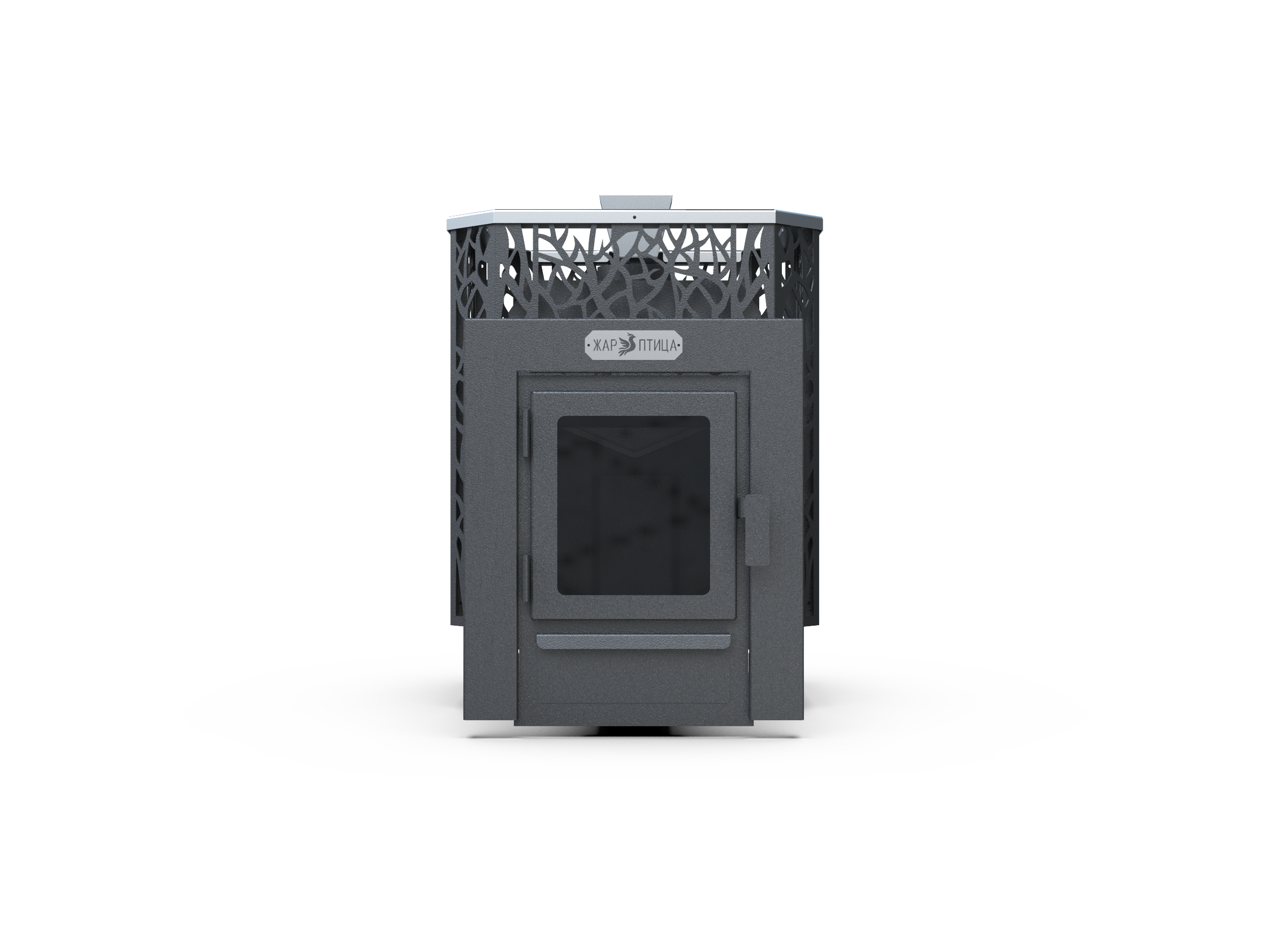 Выносная топка со стеклянной дверцей наполняет пространство уютом живого огня, а сетка Древо подчёркивает премиальный характер печи и создаёт комфортную атмосферу в парной.