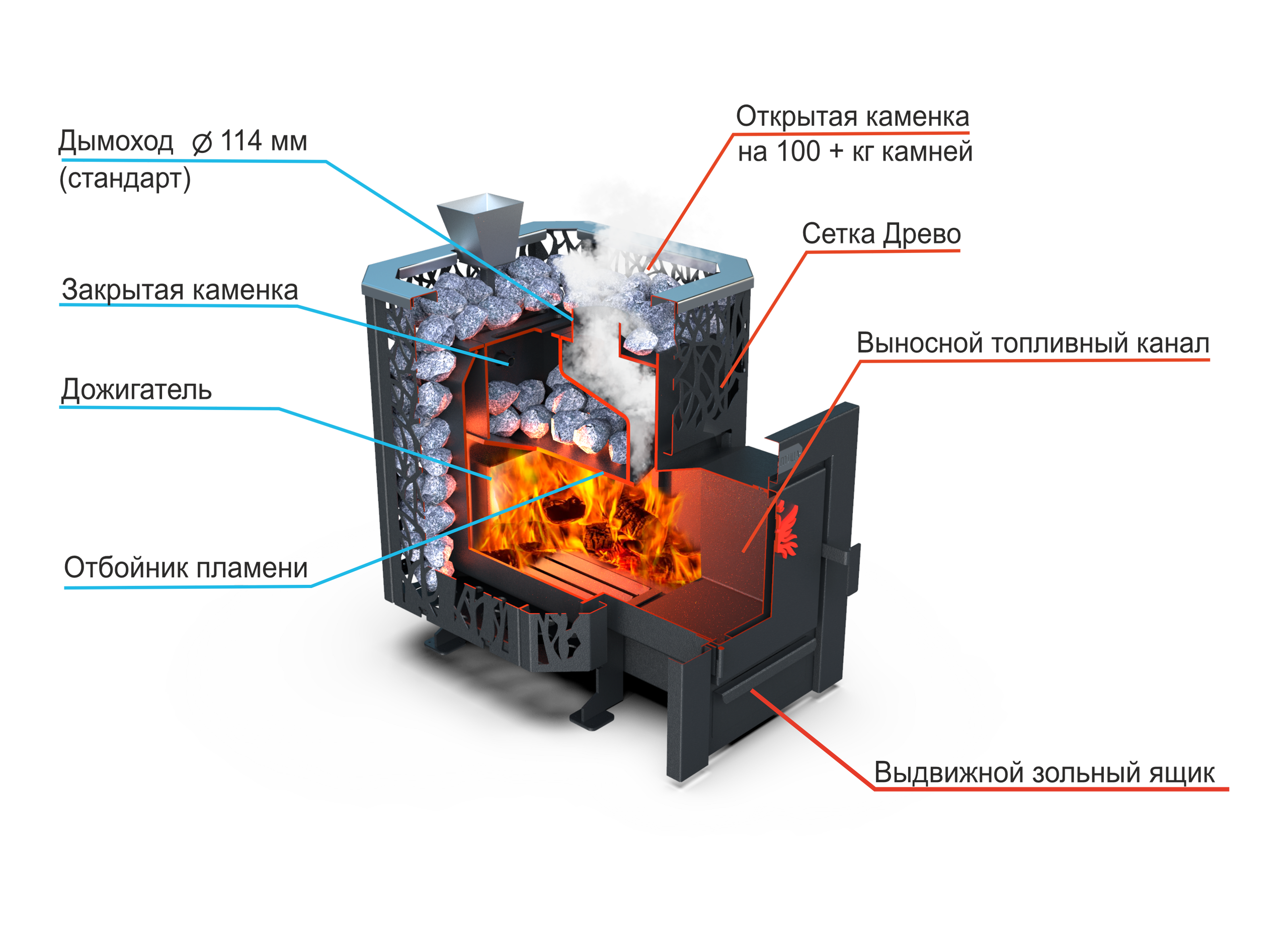 Закрытая каменка аккумулирует тепло и поддерживает высокую температуру камней, создавая мелкодисперсный «правильный» пар. Открытая каменка обеспечивает быстрый прогрев и активную теплоотдачу.