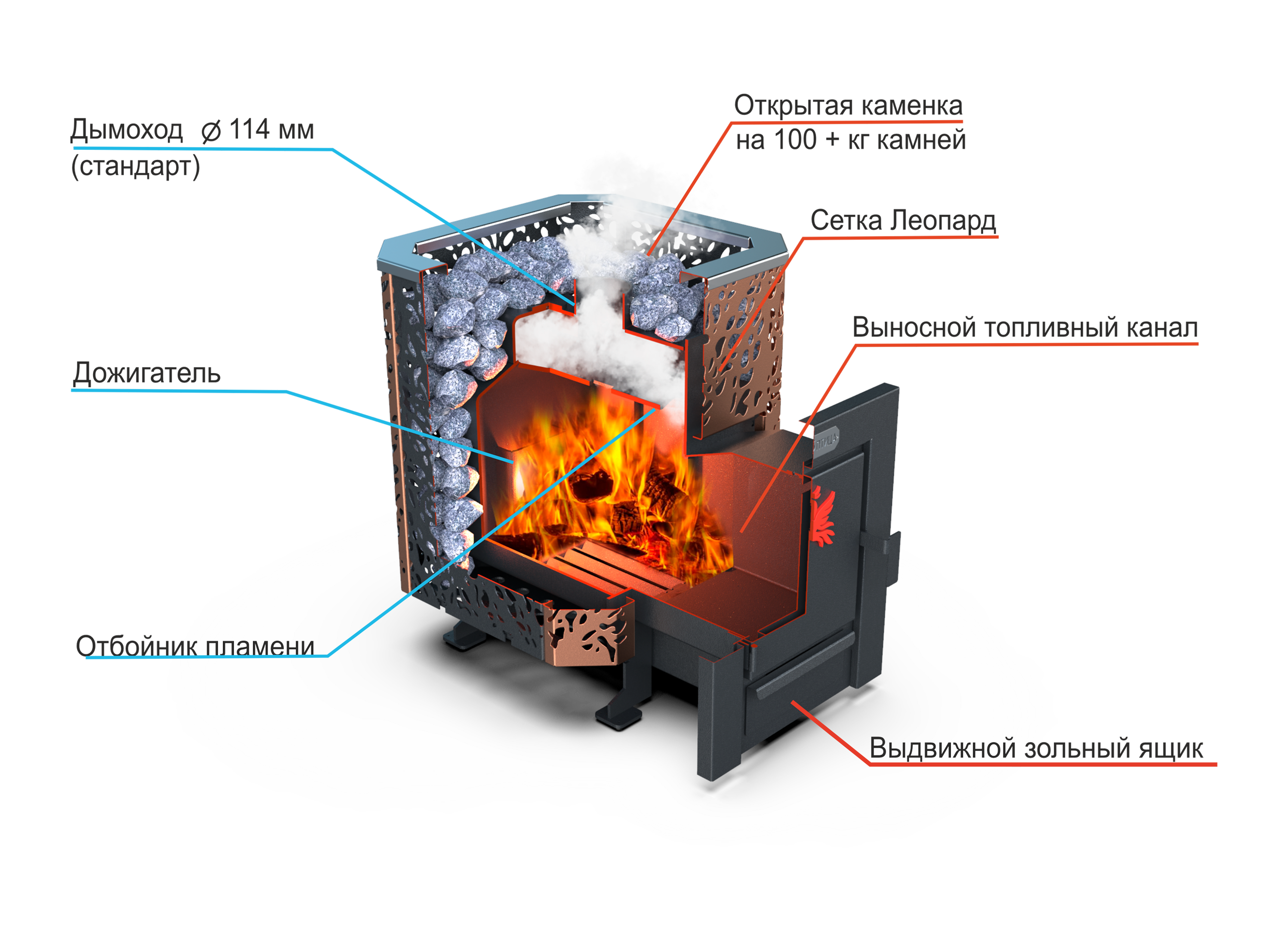 Жаропрочное стекло позволяет наслаждаться видом пламени, создавая уютную атмосферу. Выносная топка упрощает эксплуатацию и поддерживает чистоту в парной.