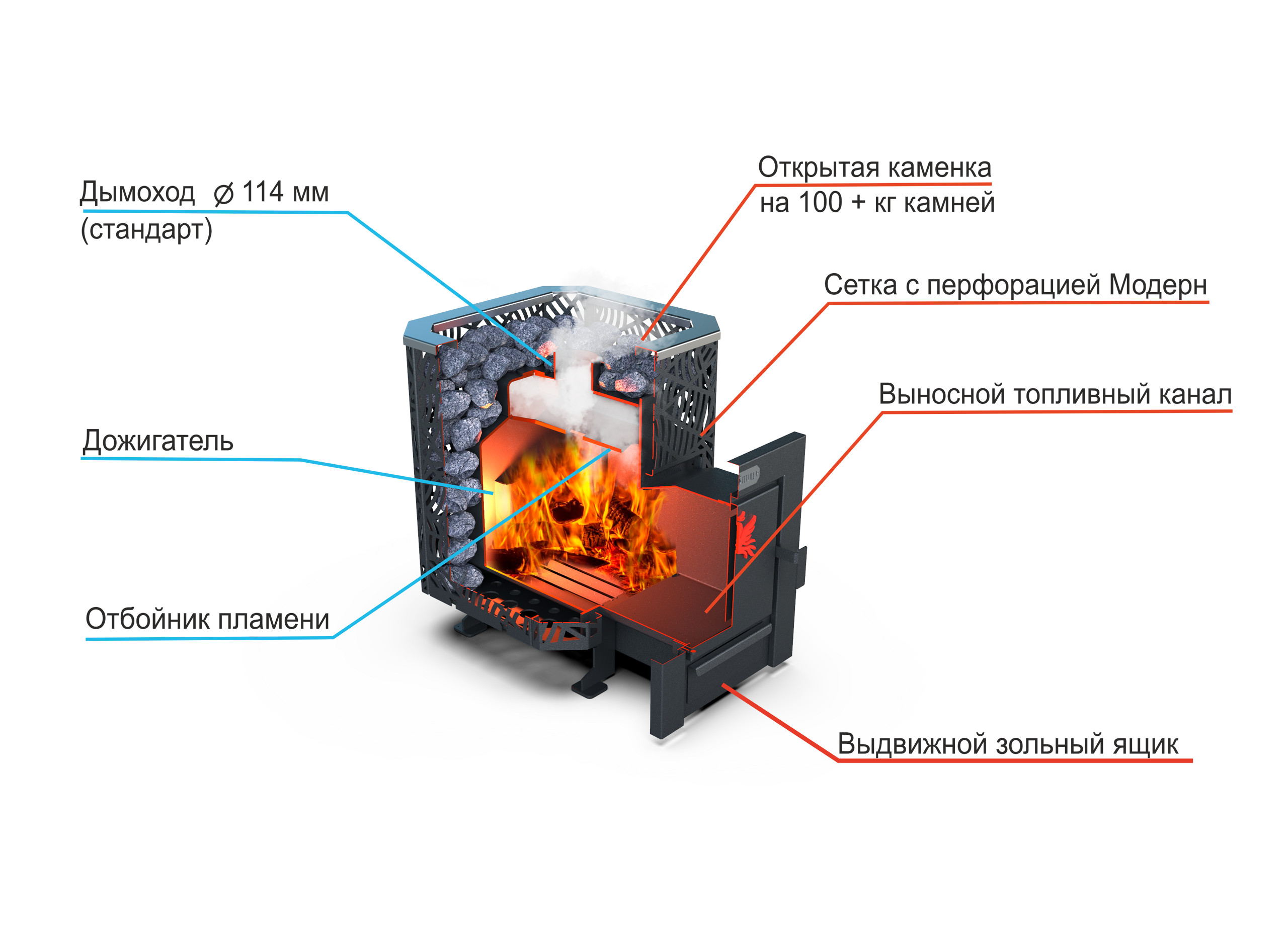 — открытая каменка для быстрого прогрева и насыщенного пара