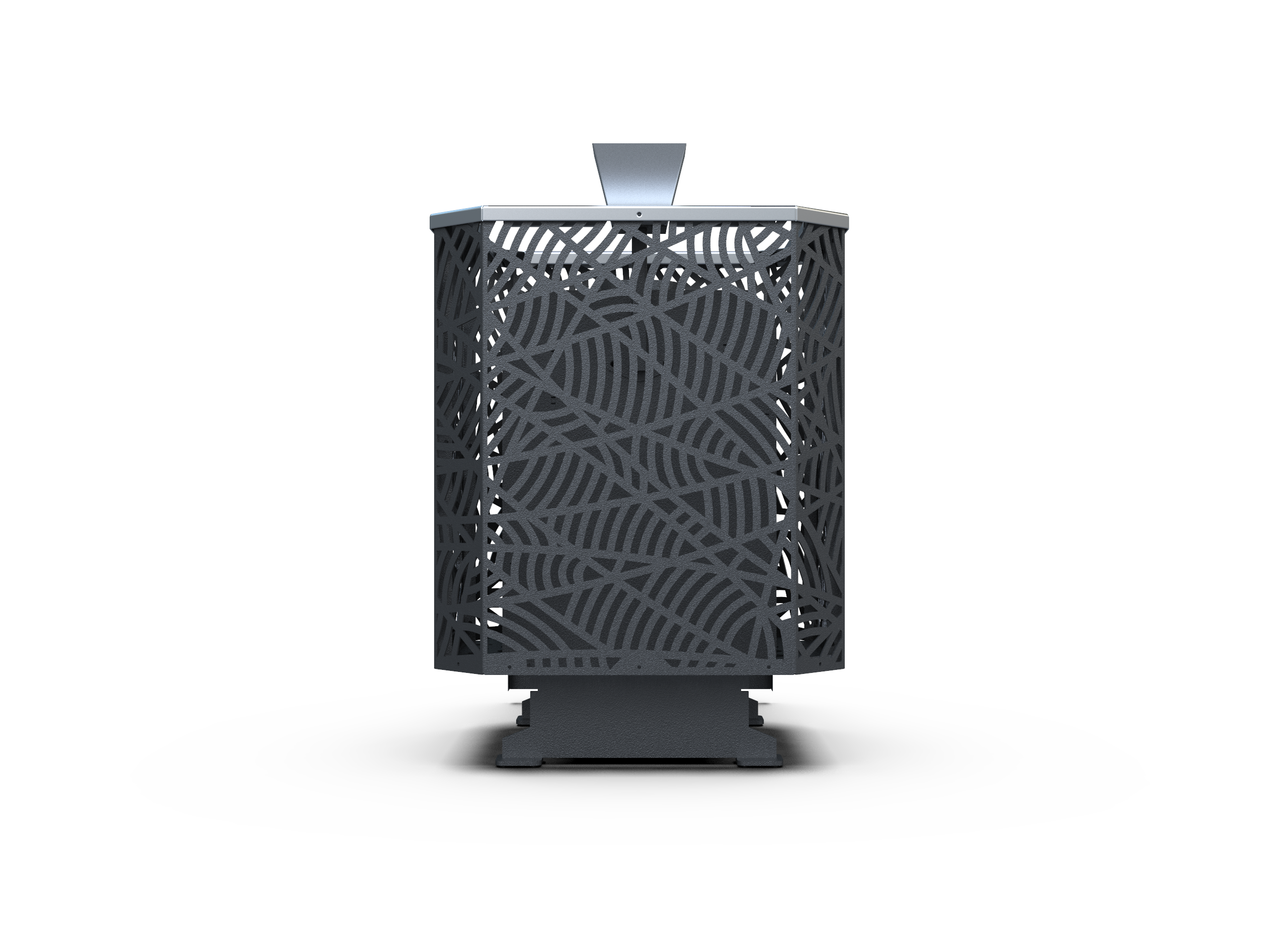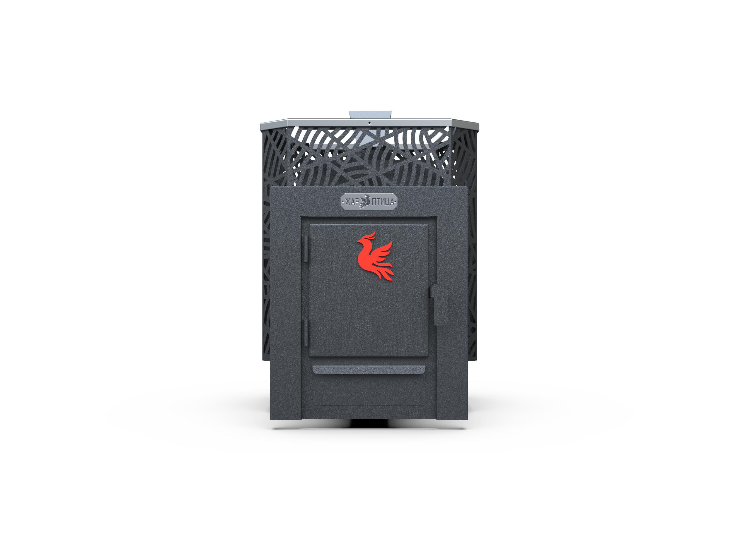 Выносная топка с металлической дверцей подчёркивает практичность и надёжность конструкции. Сетка Модерн придаёт печи сдержанный премиальный внешний вид и создаёт комфортную атмосферу в бане.