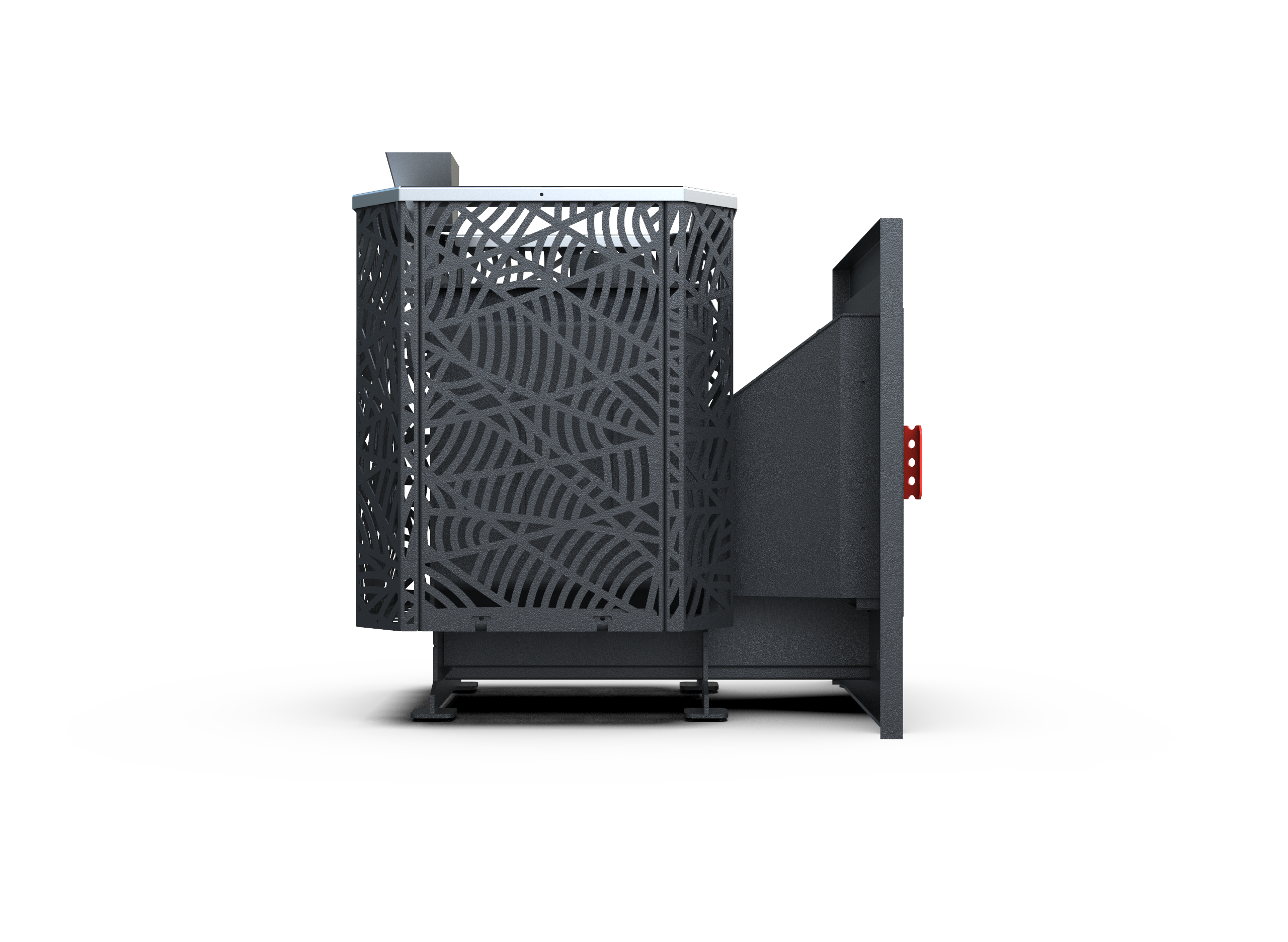 Закрытая каменка обеспечивает мягкий и глубокий пар, а открытая каменка на 100+ кг камней создаёт мощный жар и быстрый прогрев парной. Панорамная дверца превращает печь в центральный элемент бани, создавая эффект камина и атмосферу уюта.