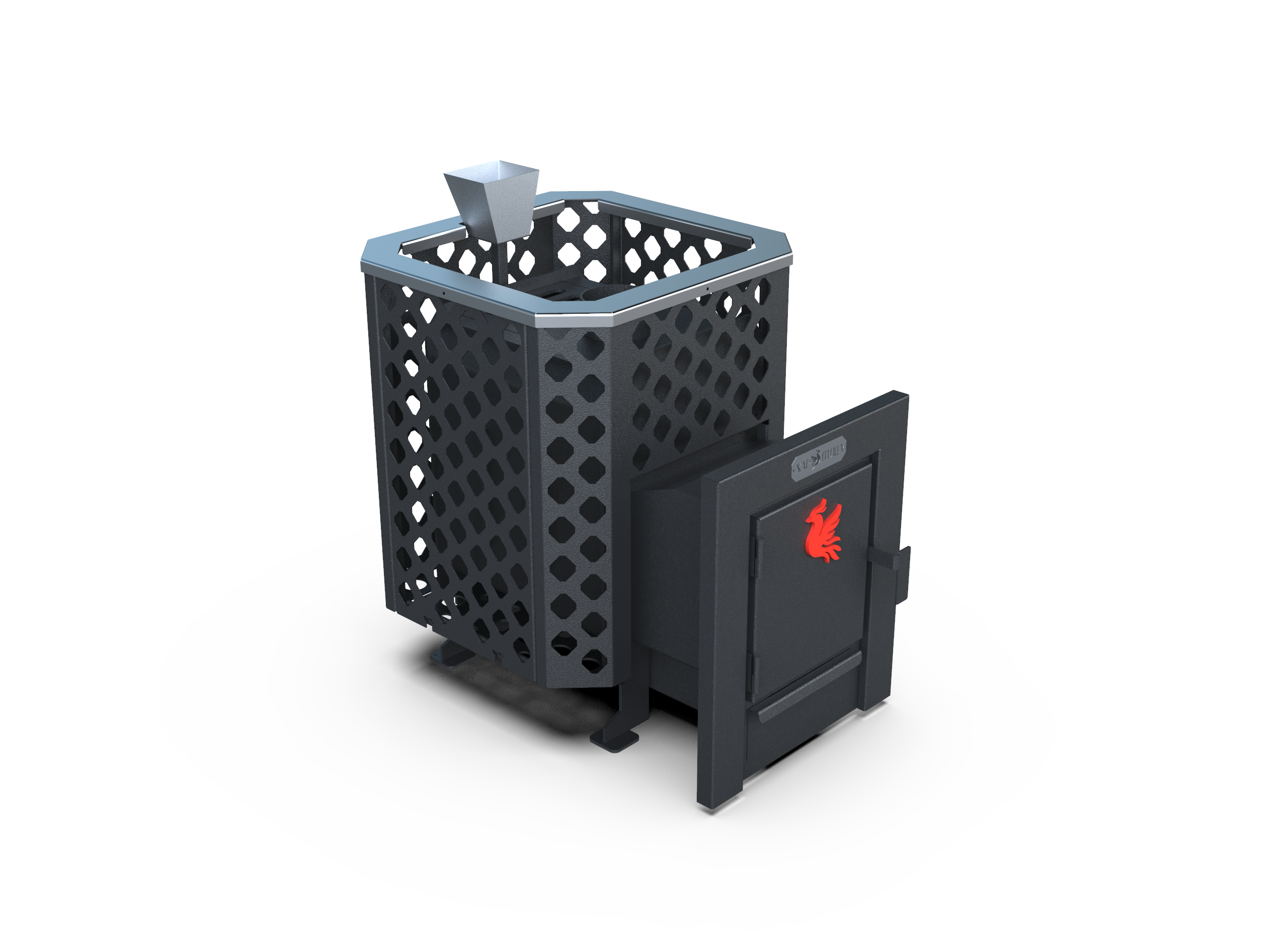 Выносная топка с металлической дверцей подчёркивает практичность и надёжность конструкции. Сетка Перфорация придаёт печи сдержанный премиальный внешний вид и создаёт комфортную атмосферу в бане.
