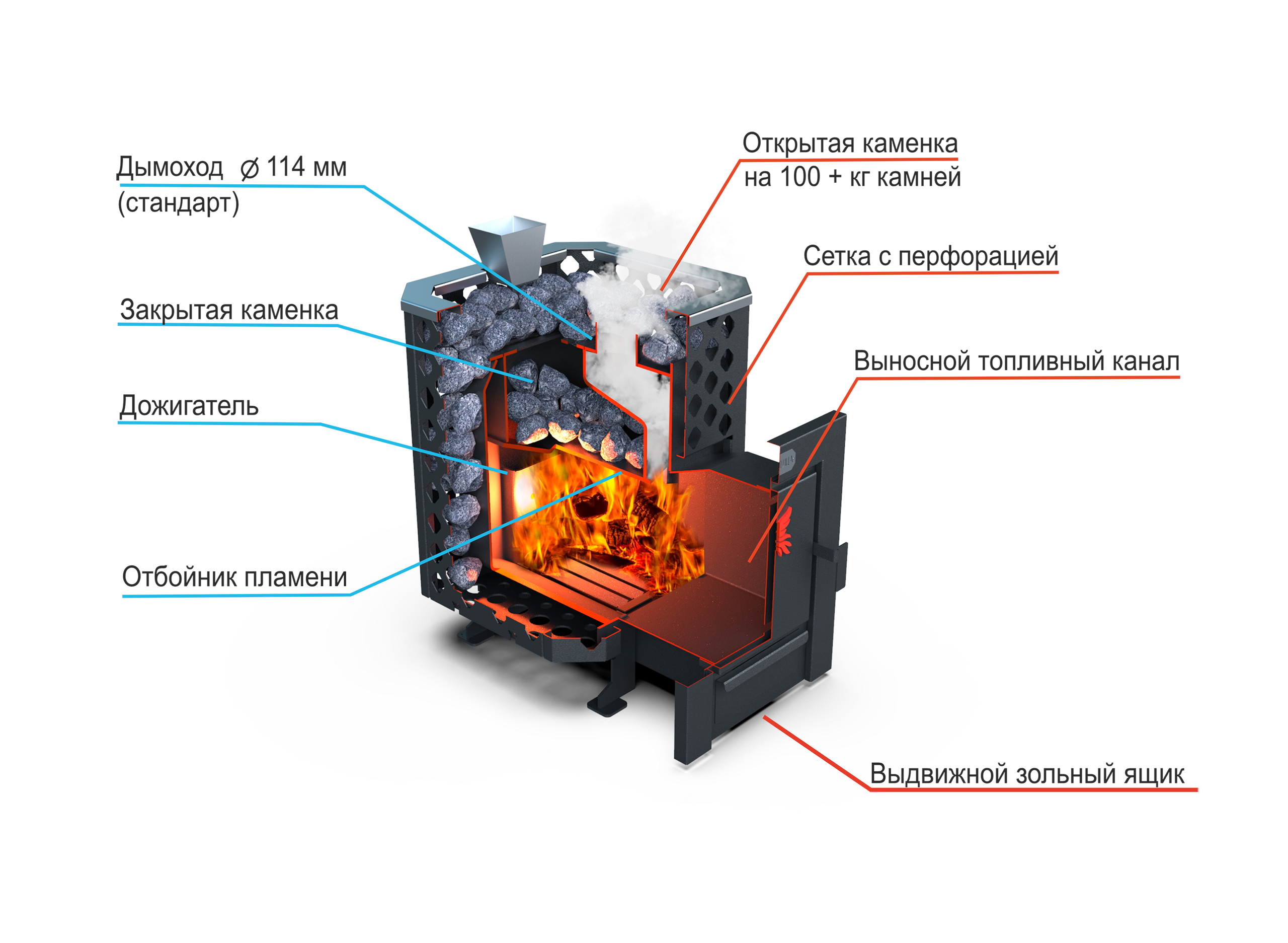Закрытая каменка аккумулирует тепло и долго удерживает высокую температуру камней, формируя лёгкий и ровный пар. Открытая каменка в конструкции «сетка» обеспечивает интенсивную теплоотдачу и быстрый набор температуры.