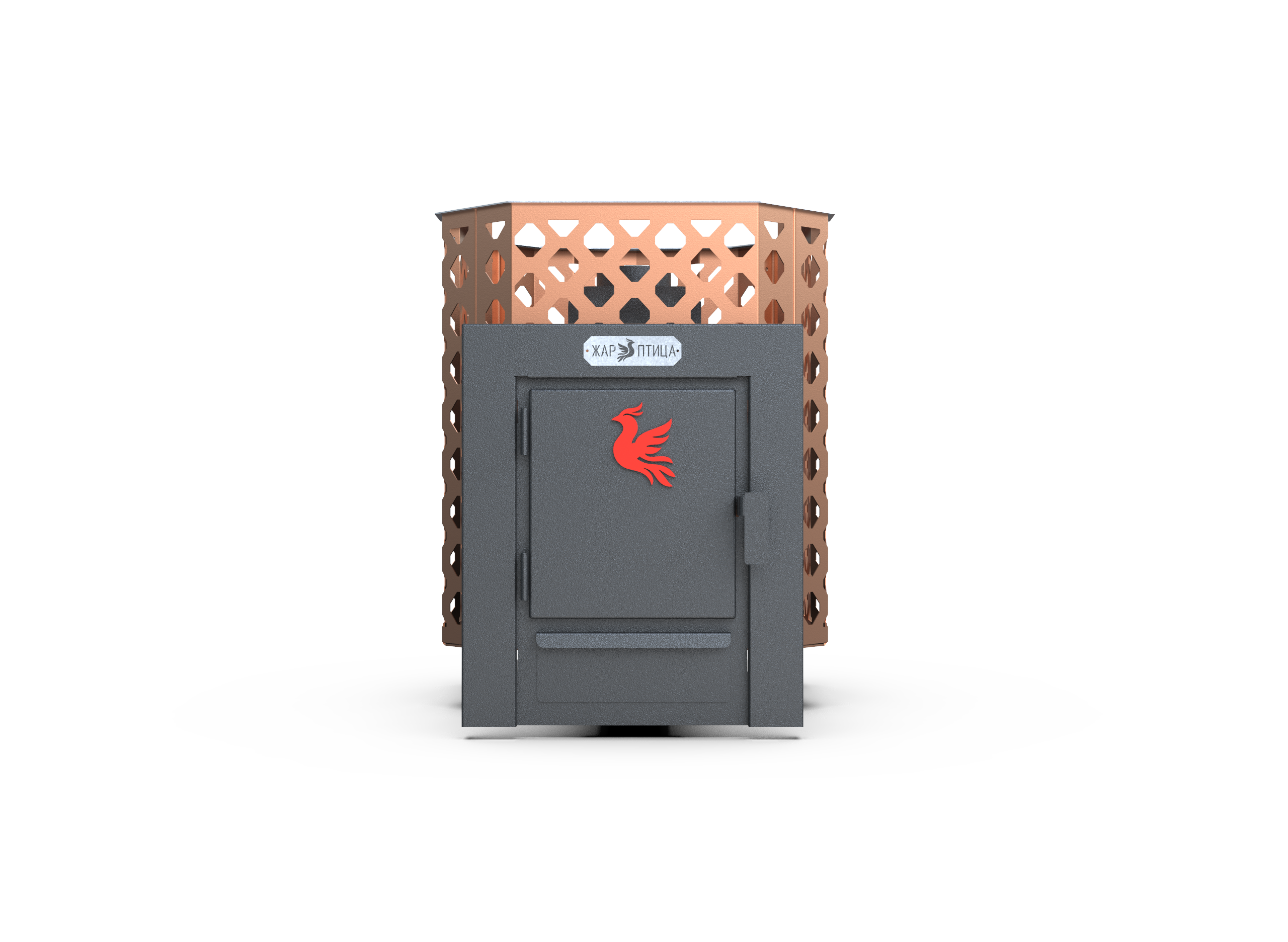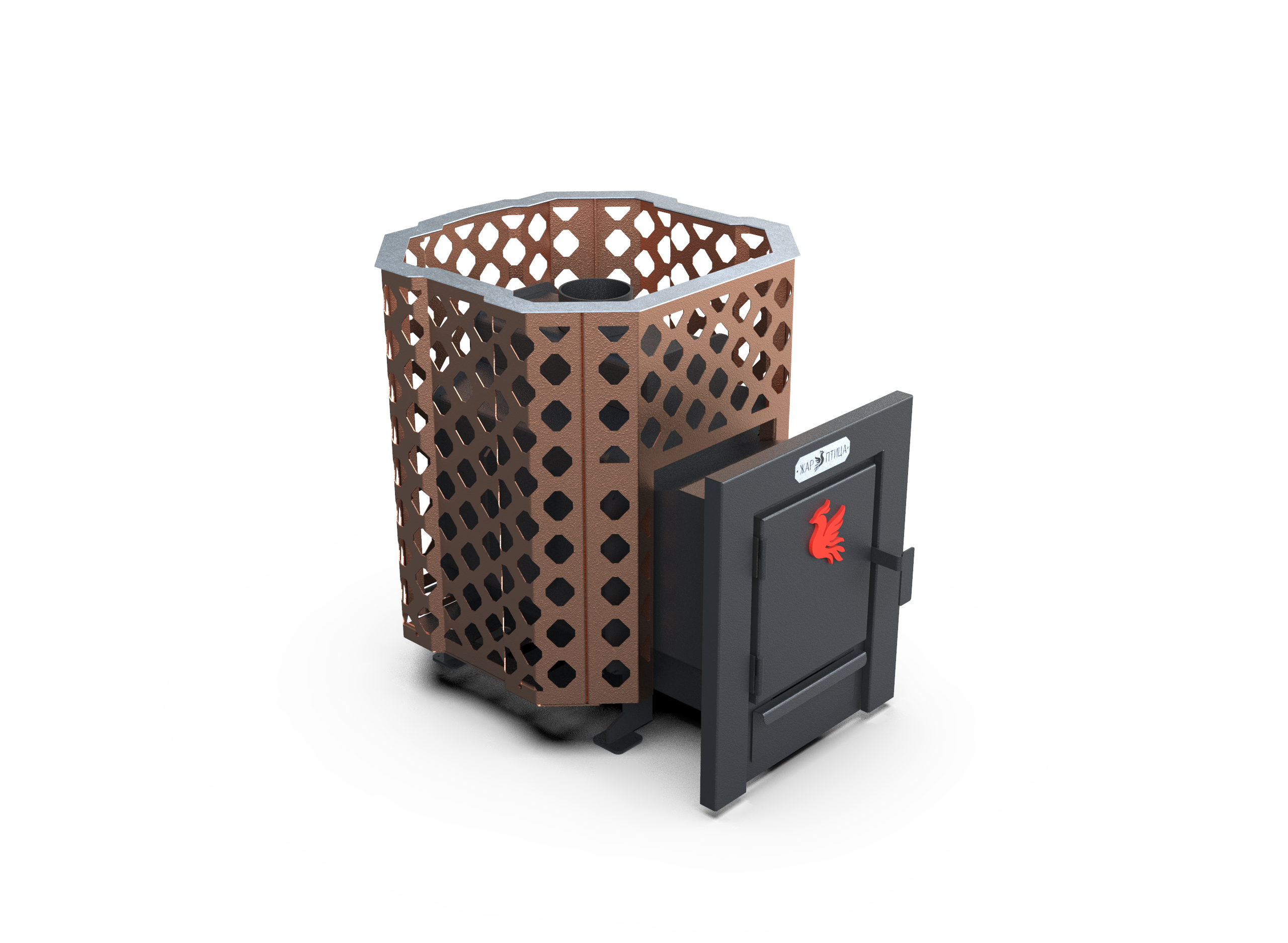 Сетка цвета «медь» придаёт печи стильный внешний вид, а диаметр дымохода 114 мм обеспечивает стабильную тягу.