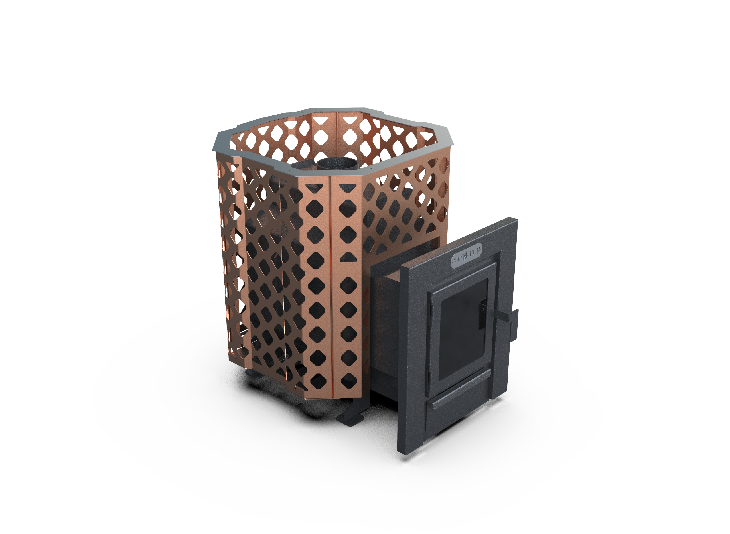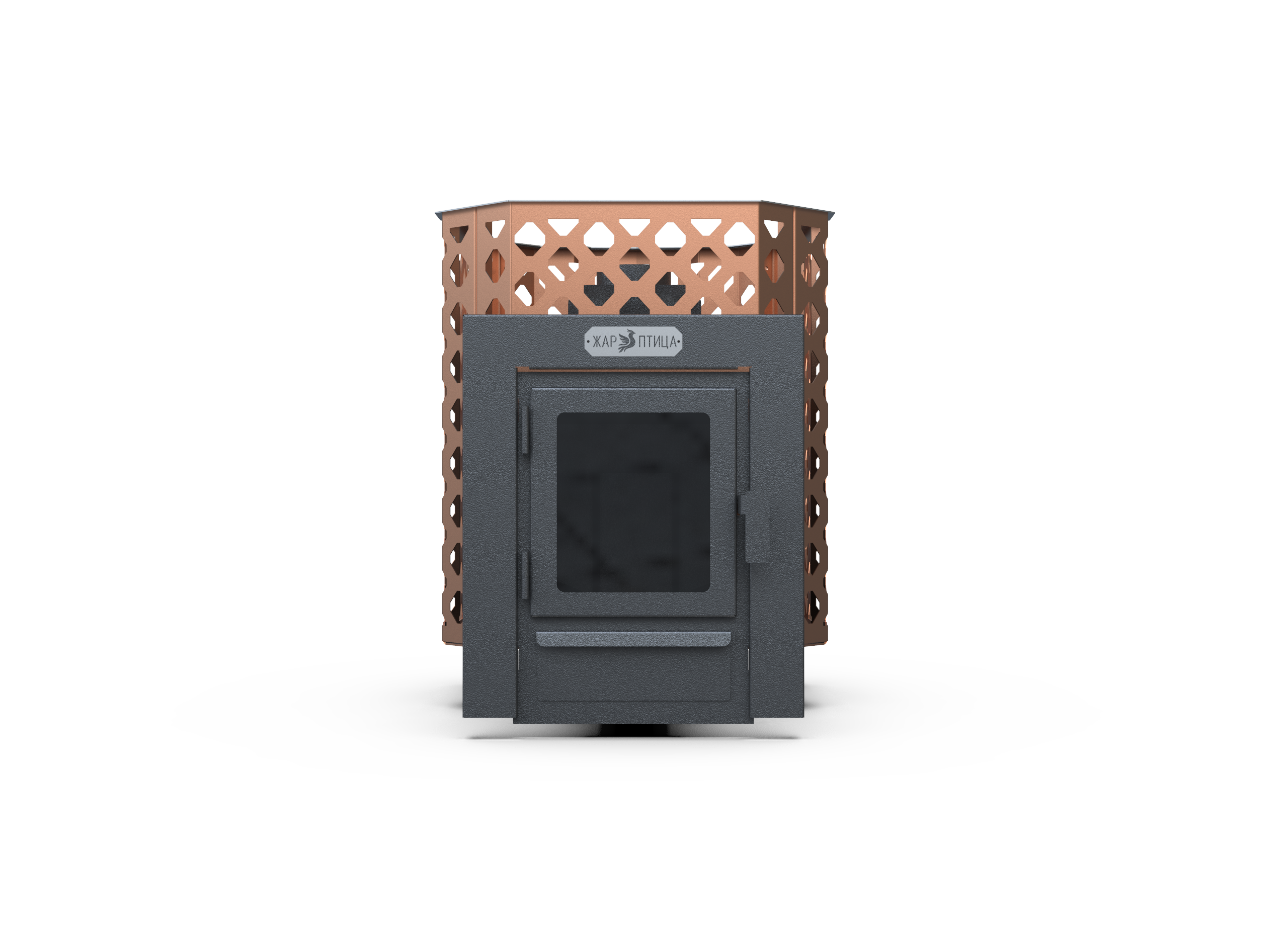 Сетка цвета «медь» делает модель заметным элементом интерьера, дымоход 114 мм гарантирует стабильную работу.