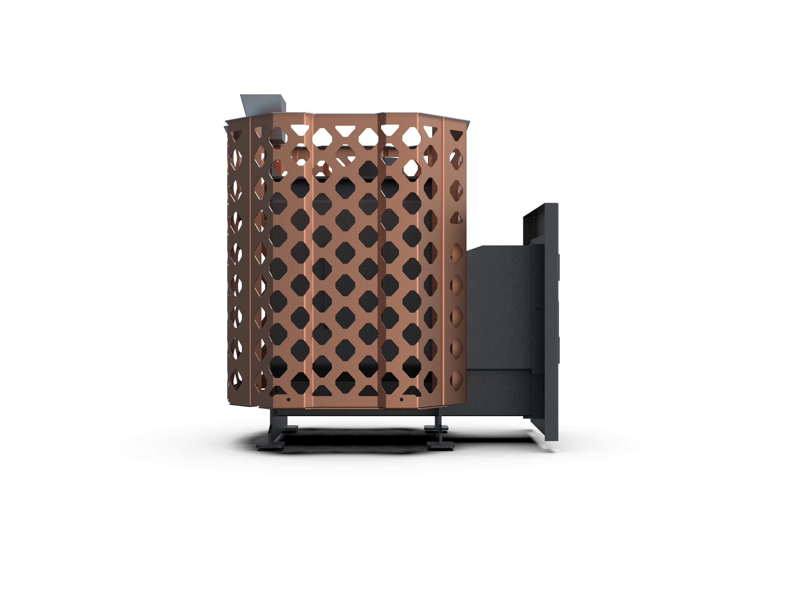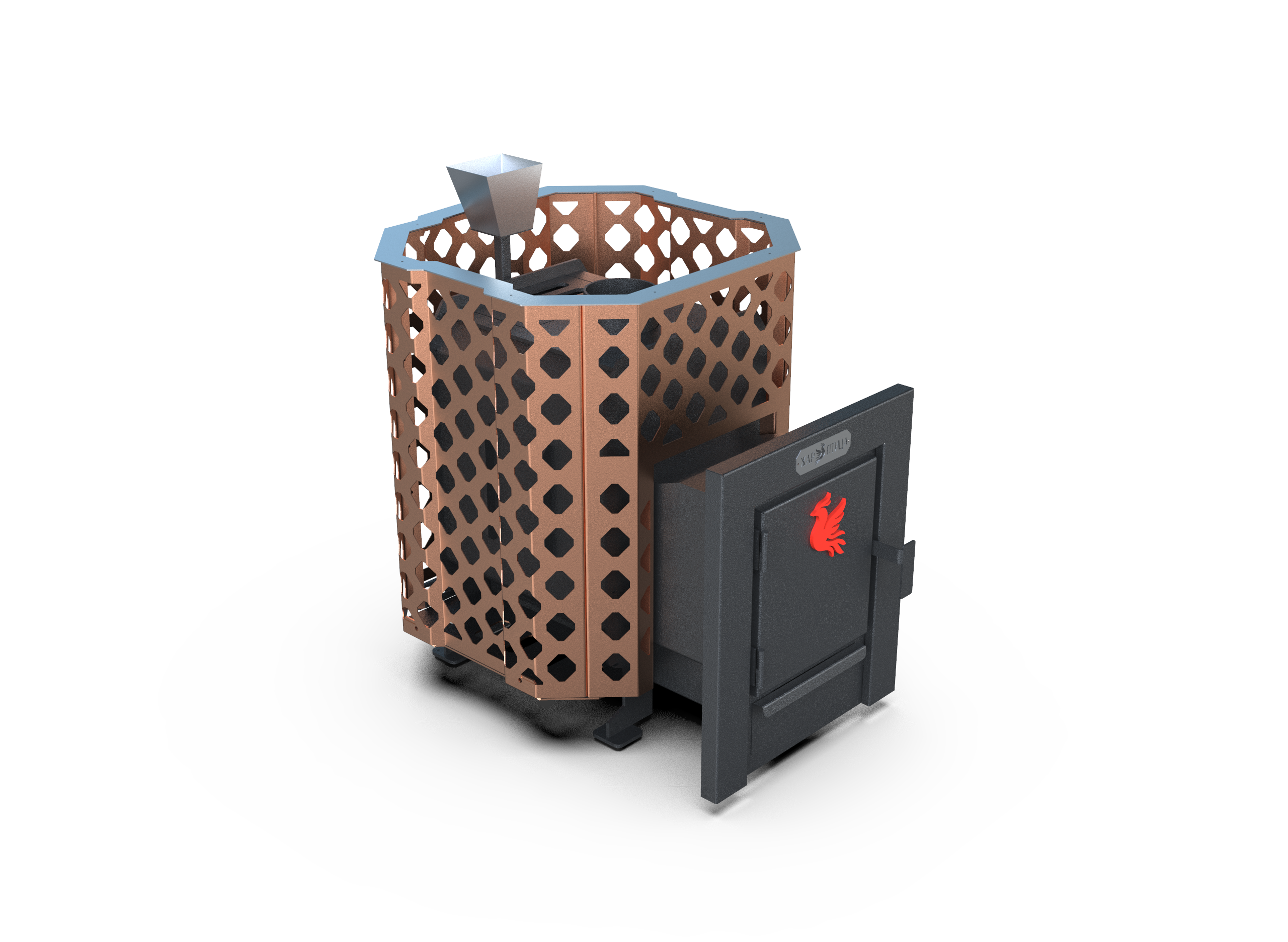 Медная сетка придаёт печи современный вид, дымоход 114 мм гарантирует стабильную работу.