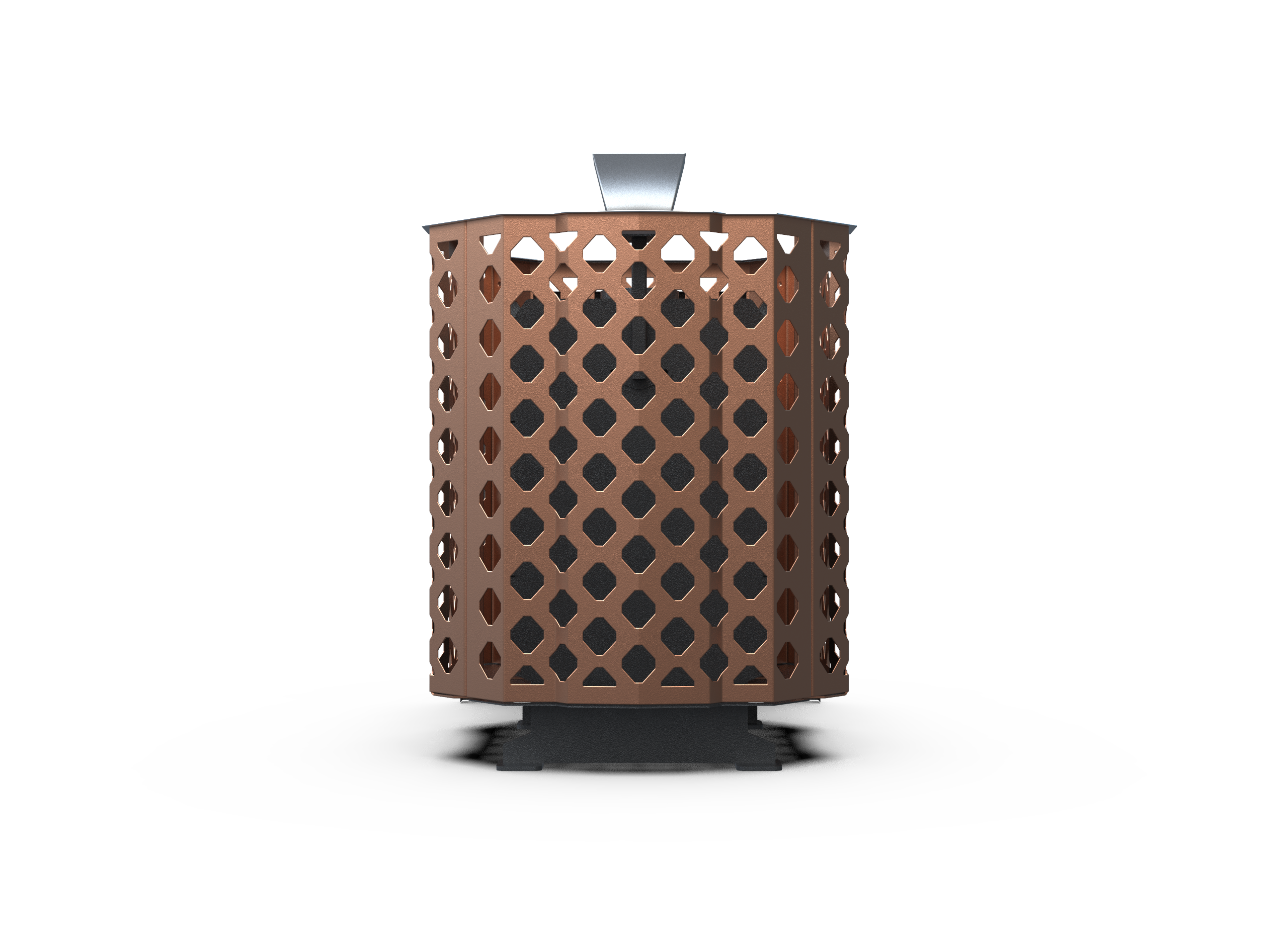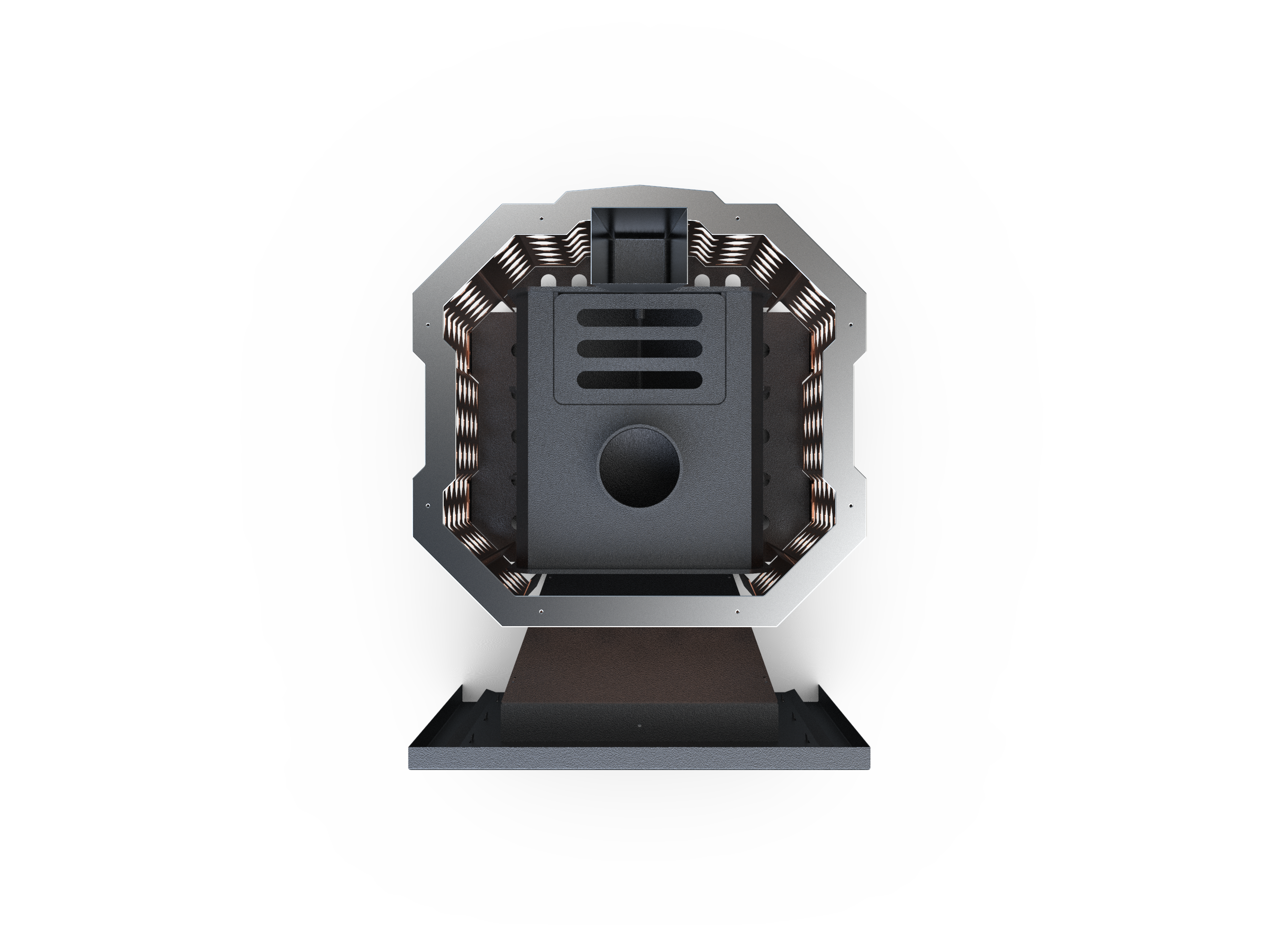 Медная сетка подчёркивает премиальный стиль, дымоход 114 мм обеспечивает стабильную тягу.