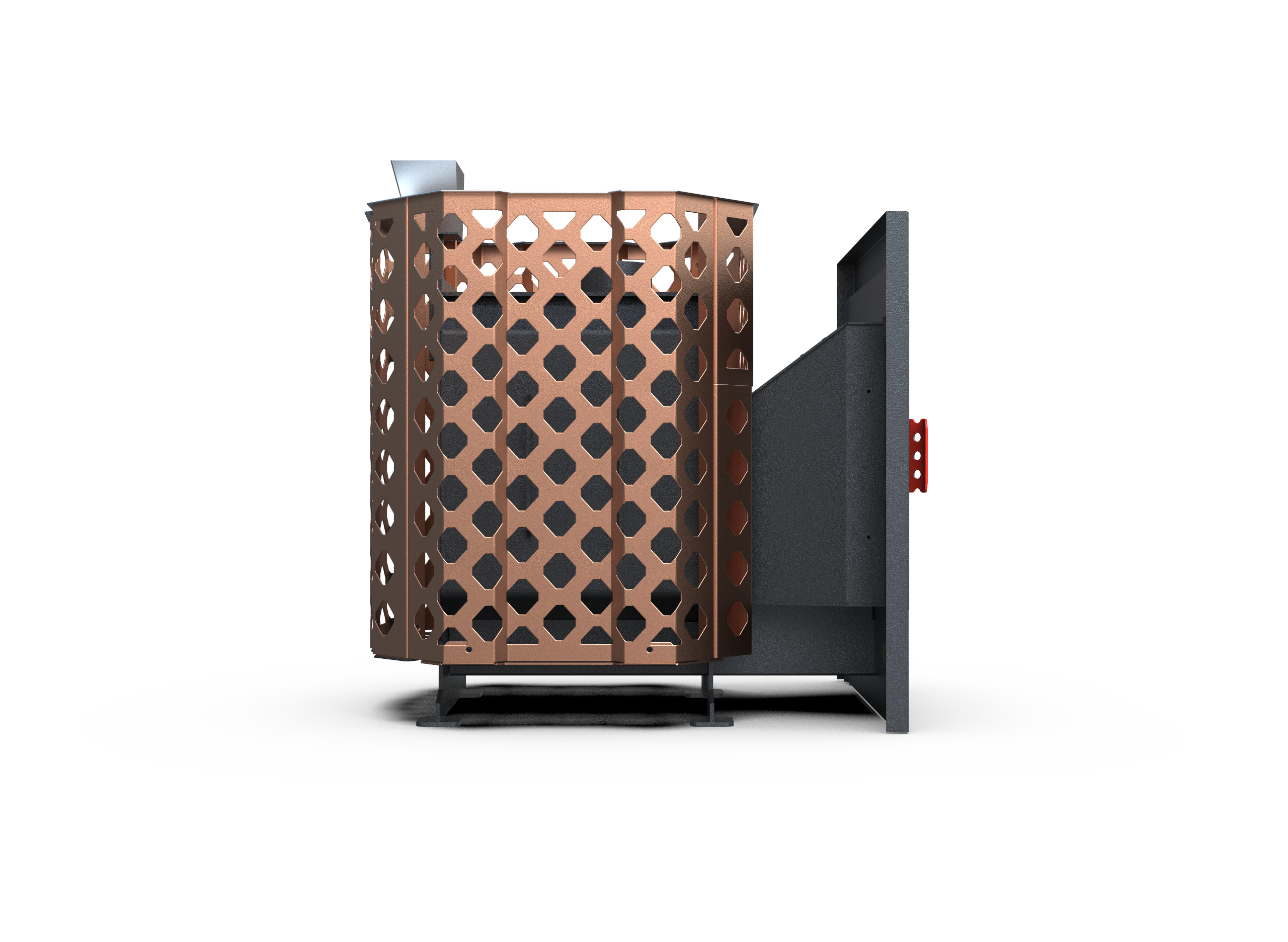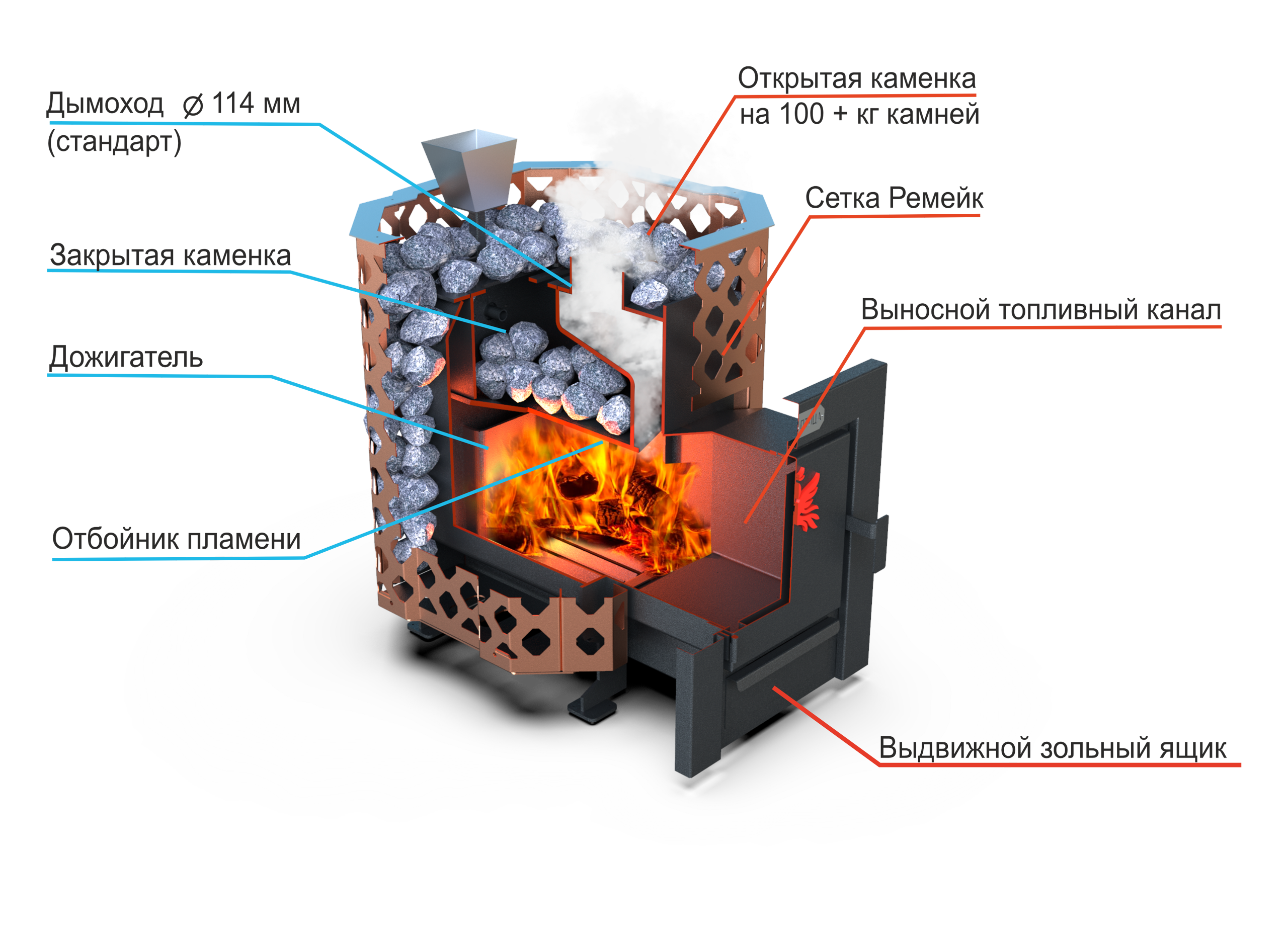 Сетка цвета «медь» подчёркивает премиальный стиль, а дымоход диаметром 114 мм обеспечивает надёжную тягу и стабильную работу.