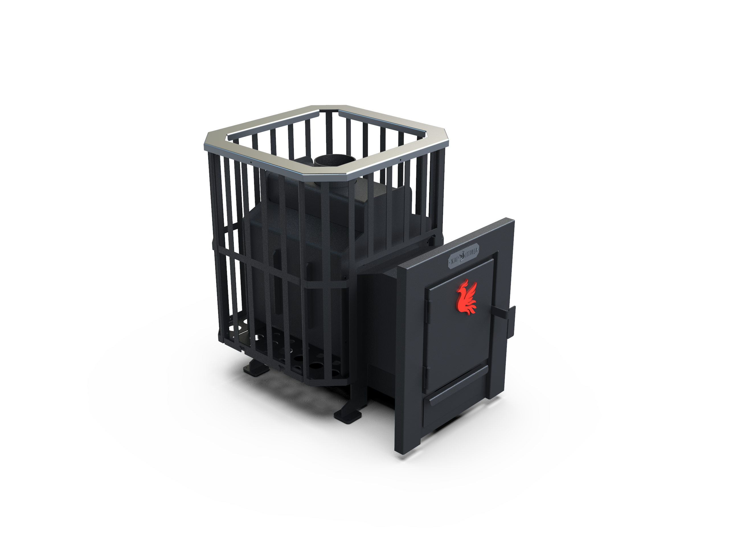 Печь оснащена открытой каменкой, что обеспечивает быстрый прогрев камней и хороший теплообмен. Конструкция «сетка» позволяет равномерно распределять тепло и получать насыщенный, живой пар.
