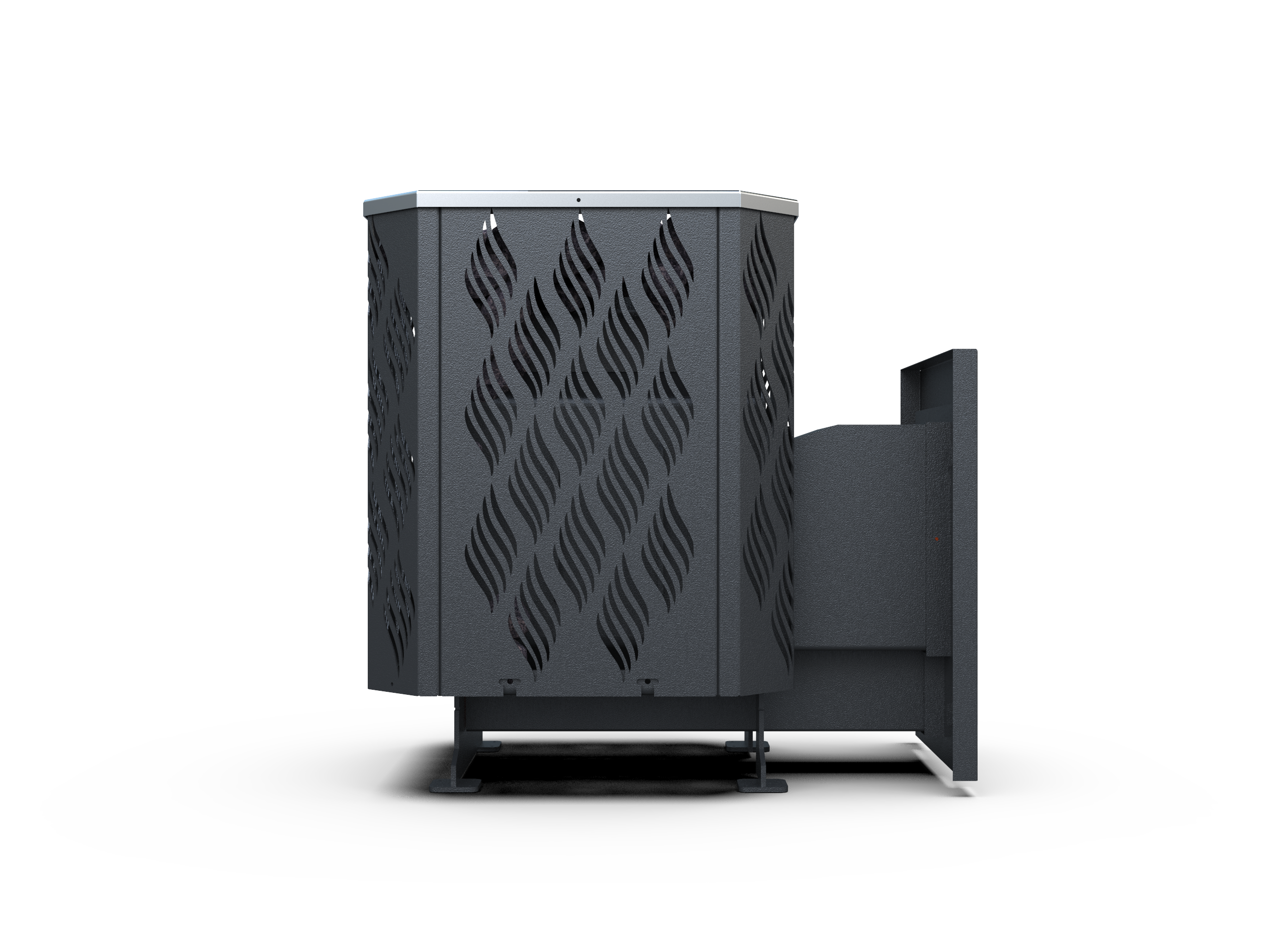 Печь оснащена открытой каменкой, что обеспечивает быстрый прогрев камней и хороший теплообмен. Конструкция «сетка» позволяет равномерно распределять тепло и получать насыщенный, живой пар.